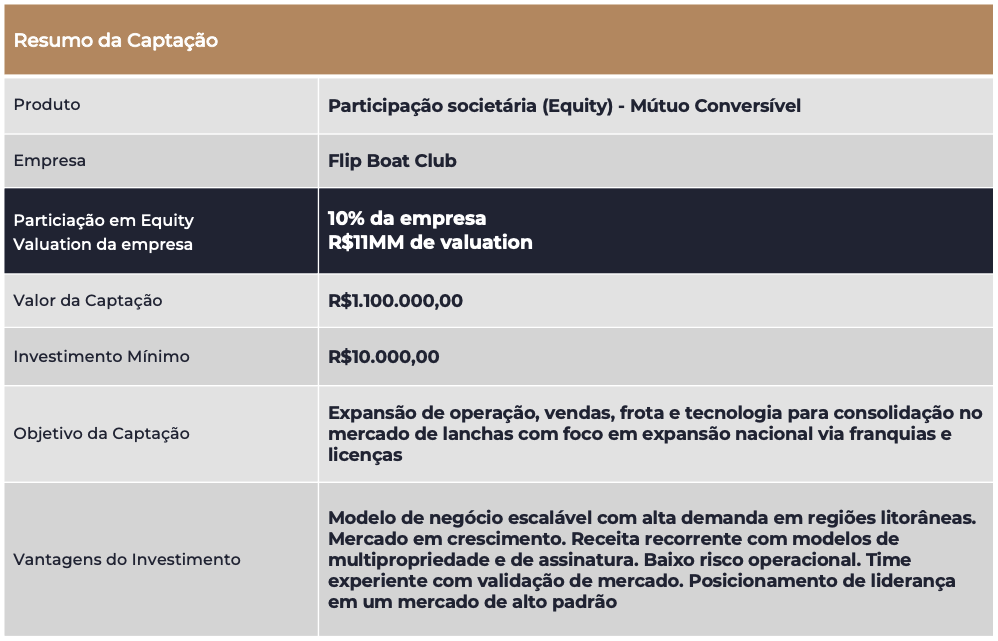 Com isso, a Flip entrega uma nova forma de consumir experiências náuticas: mais acessível, mais eficiente, com menos preocupações e com a conveniência de um clube de assinatura. O investidor participa de um modelo que já está validado e tem aderência crescente no mercado de alto padrão, com forte potencial de crescimento.