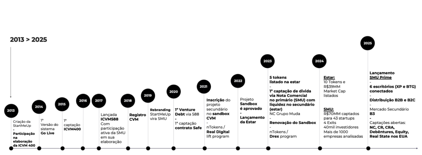 Desde 2013, a SMU foi protagonista na criação e regulamentação do setor de crowdfunding no Brasil. Estruturamos mais de 70 operações, captamos mais de R$ 100 milhões, analisamos mais de mil empresas e construímos uma base de 40 mil investidores. Não apenas trouxemos esse mercado para o país — ajudamos a regulá-lo, criamos a tecnologia e montamos a infraestrutura que agora está pronta para escalar.
